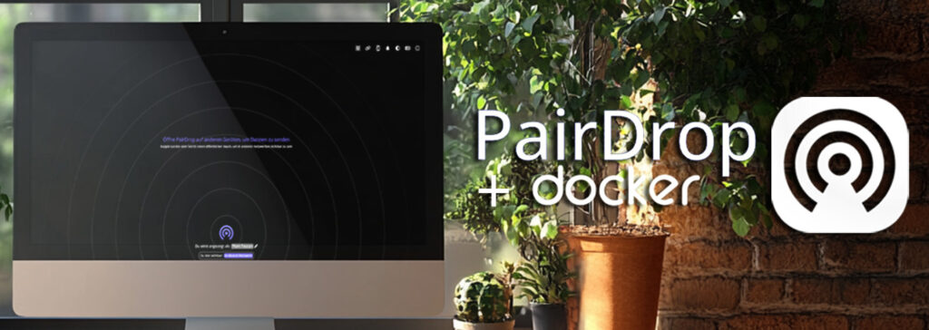 Computerbildschirm mit PairDrop-Logo und Docker-Symbol in einem modernen Büro mit Pflanzen.